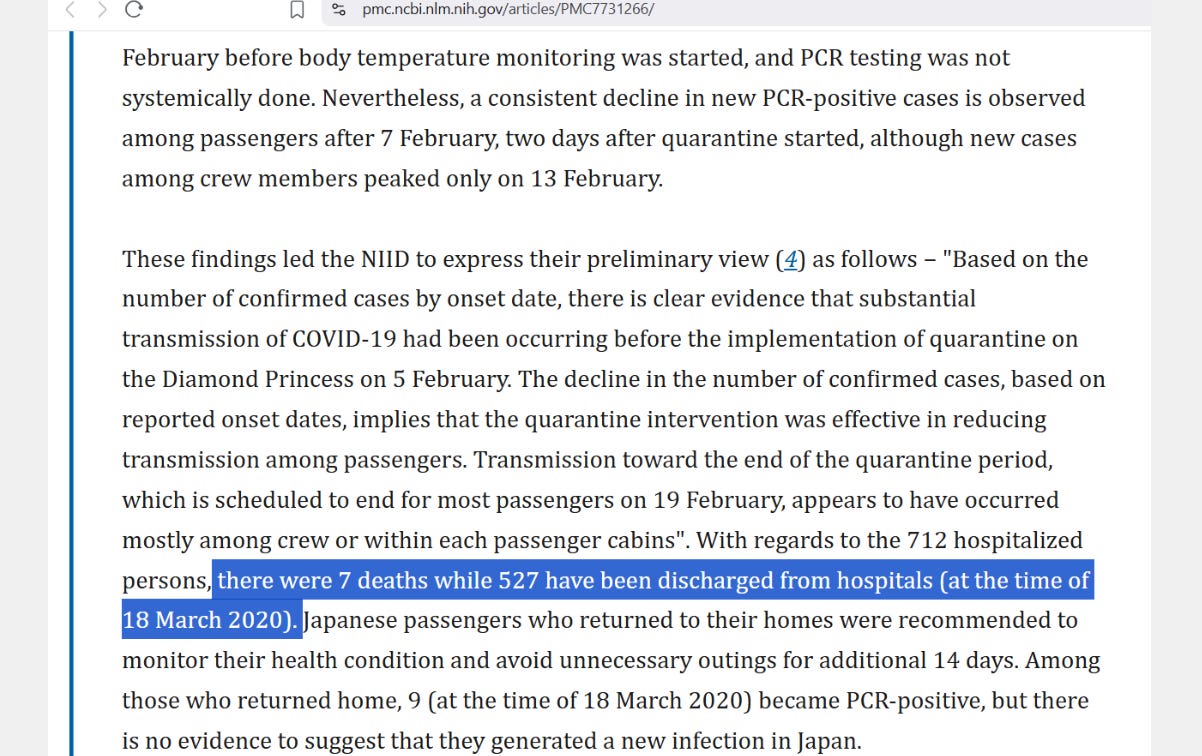 [by 18 Mar 2020 (over a month past last passenger infection): 7 passenger deaths] — Jimi H, Hashimoto G. Challenges of COVID-19 outbreak on the cruise ship Diamond Princess docked at Yokohama, Japan: a real-world story. Glob Health Med. 2020 Apr 30;2(2):63-65. doi: 10.35772/ghm.2020.01038. PMID: 33330779; PMCID: PMC7731266. https://pmc.ncbi.nlm.nih.gov/articles/PMC7731266/