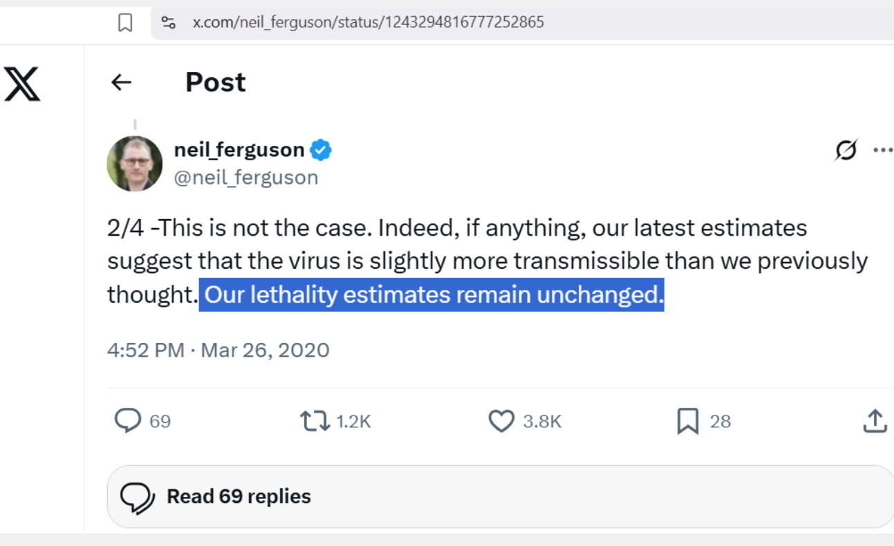 Prominent British COVID modeler, Neil Ferguson, earned the title of Professor Lockdown. In March 2020, he claimed that COVID was a type of thing which could kill 40 million people: