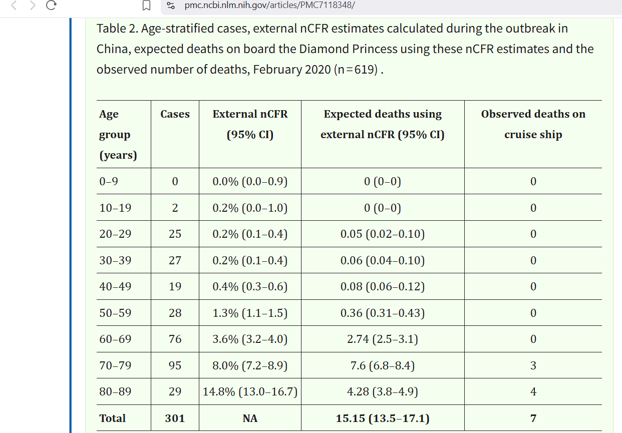 [the 7 Diamond Princess passenger deaths were all age 70-plus (most were 80-plus)] — Russell TW, Hellewell J, Jarvis CI, van Zandvoort K, Abbott S, Ratnayake R; CMMID COVID-19 working group; Flasche S, Eggo RM, Edmunds WJ, Kucharski AJ. Estimating the infection and case fatality ratio for coronavirus disease (COVID-19) using age-adjusted data from the outbreak on the Diamond Princess cruise ship, February 2020. Euro Surveill. 2020 Mar;25(12):2000256. doi: 10.2807/1560-7917.ES.2020.25.12.2000256. PMID: 32234121; PMCID: PMC7118348. https://pmc.ncbi.nlm.nih.gov/articles/PMC7118348/