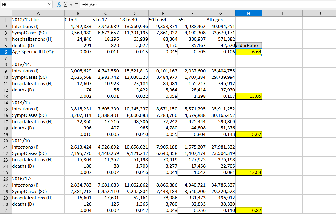 But if you use the age distribution for flu deaths to estimate the overall COVID infection fatality rate from these elderly COVID deaths — i.e., the elderly flu IFR is over 6x higher than the overall flu IFR — then COVID works out to be only approximately as lethal as a severe seasonal flu, and you can’t cause 40 million deaths with seasonal flu: