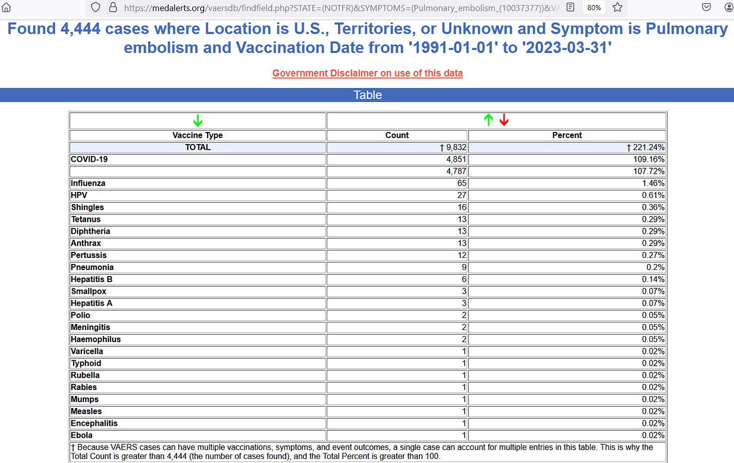 Given 673 million COVID shots by March 2023, the reporting rate for Pulmonary Embolism is 6.6 reports per million doses — while the reporting rate regarding other vaccines is far below 1 report per million doses. This means that COVID shots are more than 6.6 times more likely to lead to pulmonary embolism as other shots are.