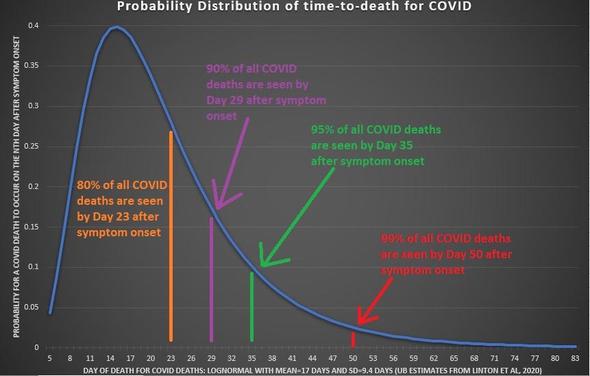 This adjustment was made using an estimate from a “time-to-death” analysis. Here is a depiction of the distribution of deaths after infection: