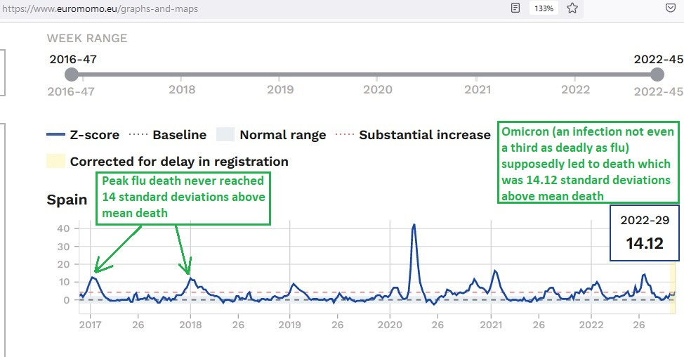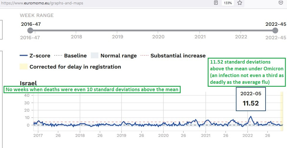 But the peak at far right is inexplicable. It’s higher than during the severe flu of 2017/18, yet Omicron is not even a third as deadly as average flu, let alone severe flu.