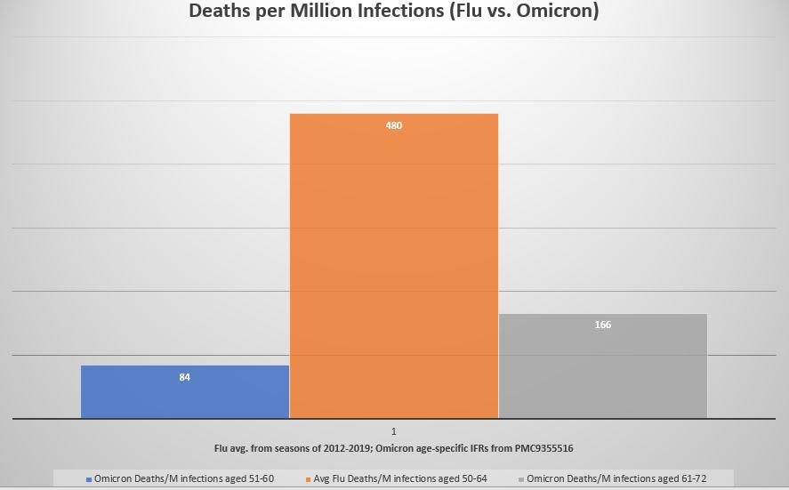 At right (gray) is the expected number of deaths from a million Omicron infections in the age bracket of 61-72 — an age bracket even older than that used for the flu.
