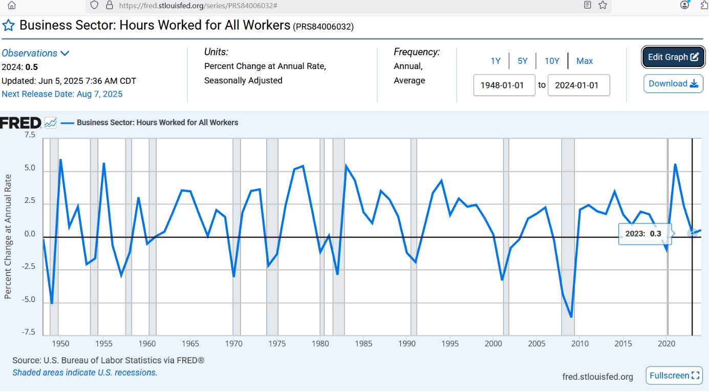 U.S. Bureau of Labor Statistics, Business Sector: Hours Worked for All Workers [PRS84006032], retrieved from FRED, Federal Reserve Bank of St. Louis; https://fred.stlouisfed.org/series/PRS84006032