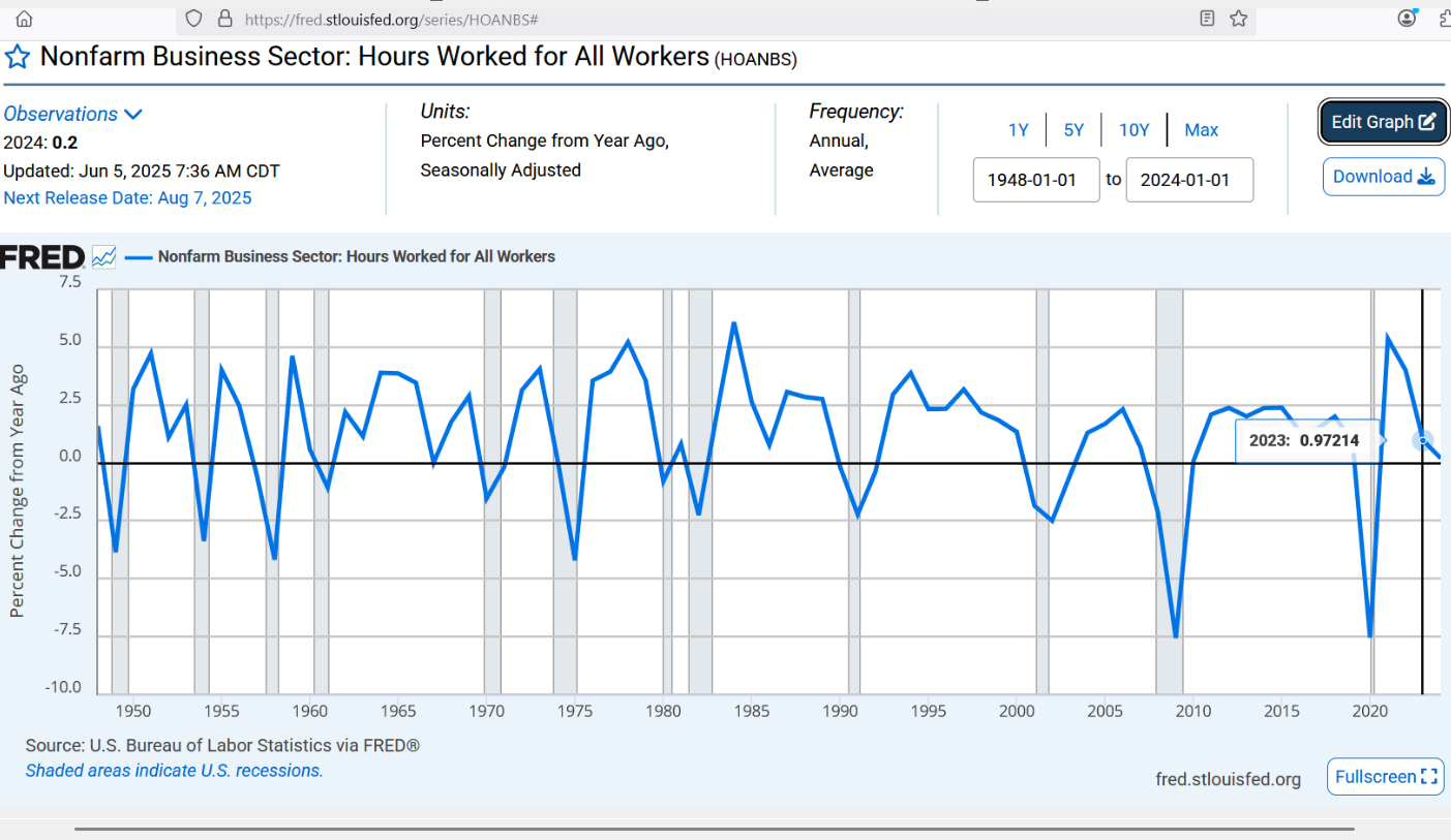 U.S. Bureau of Labor Statistics, Nonfarm Business Sector: Hours Worked for All Workers [HOANBS], retrieved from FRED, Federal Reserve Bank of St. Louis; https://fred.stlouisfed.org/series/HOANBS