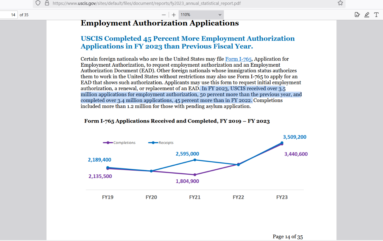 U.S. Citizenship and Immigration Services Annual Statistical Report Fiscal Year 2023, Page 14. https://www.uscis.gov/sites/default/files/document/reports/fy2023_annual_statistical_report.pdf