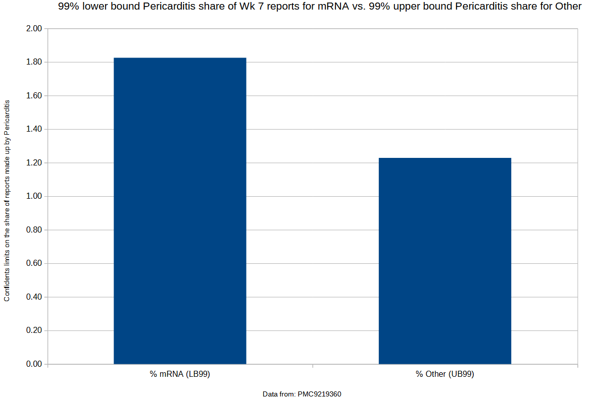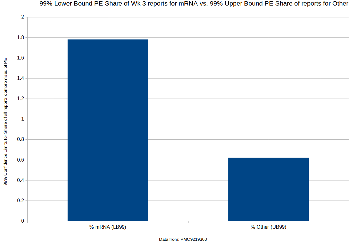 Even though 99% confidence intervals on the proportion of all reports comprised by pulmonary embolism shows such high significance, pulmonary embolism was still not mentioned in the warning section of the product labels for mRNA shots, even as late as June 2022.