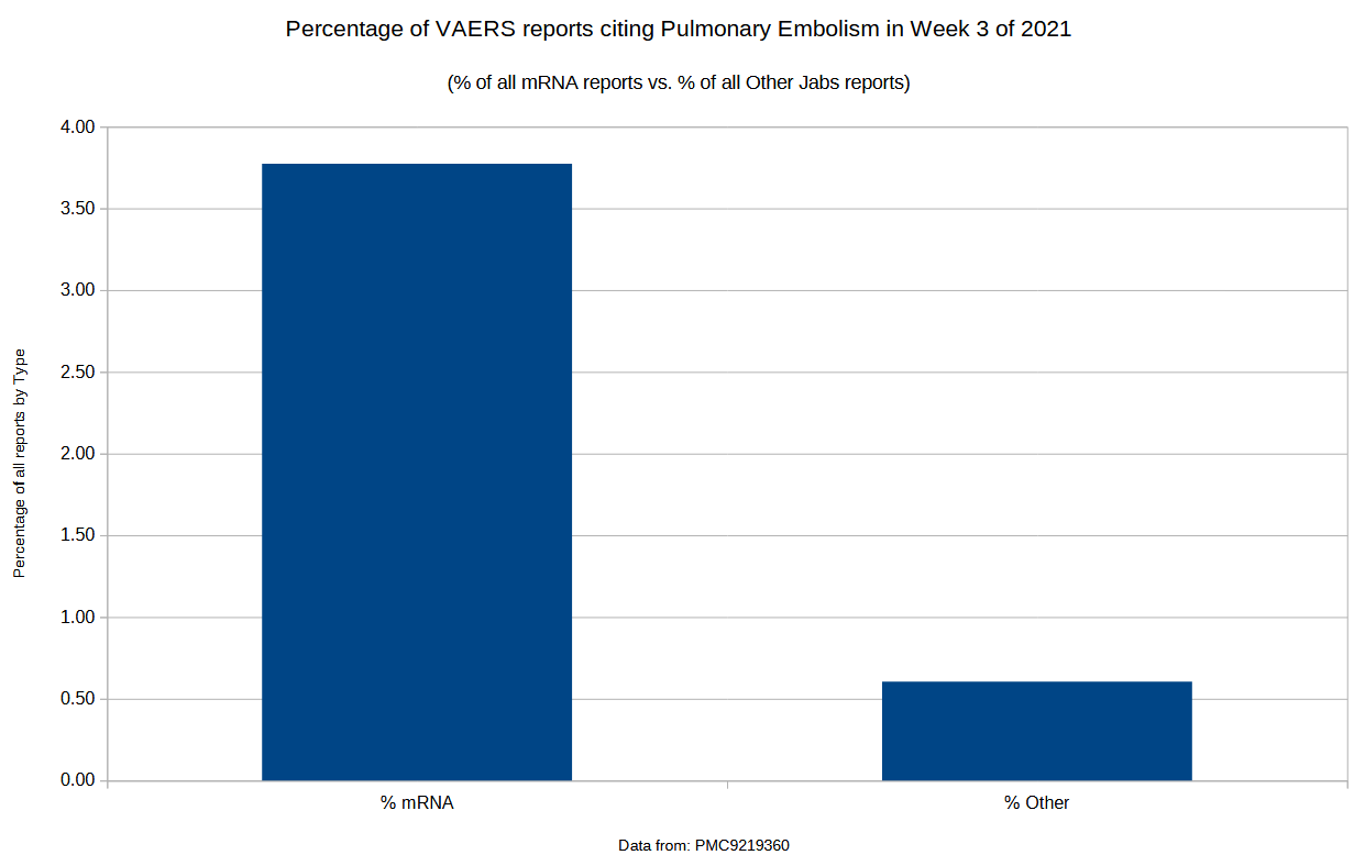 In terms easier to comprehend, for mRNA shots, 1 in every 27 (3.8%) of the adverse event reports to VAERS in Week 3 of 2021 were for pulmonary embolism, but for all other injections, only 1 in every 165 reports were for pulmonary embolism (0.6%).