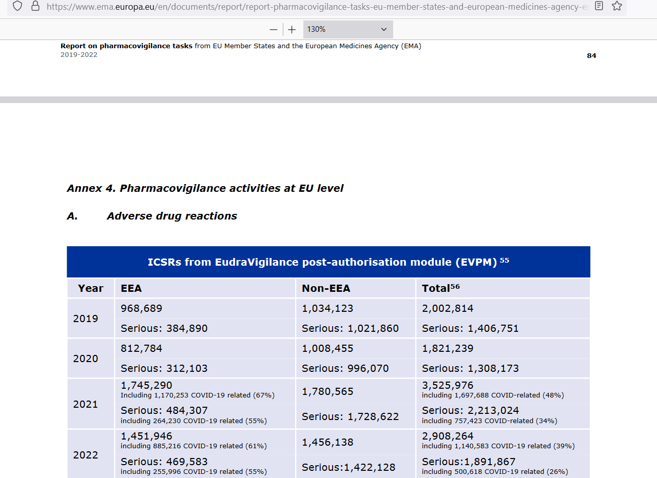 The itemized numbers for 2021 and 2022 at bottom-left show that serious ICSRs for COVID shots (484,307) ran higher than all serious ICSRs for all of the 6,000 or so medical substances approved in the EU for the years of 2019 and 2020. That’s one type of thing being higher than 6,000 other types of things put together.