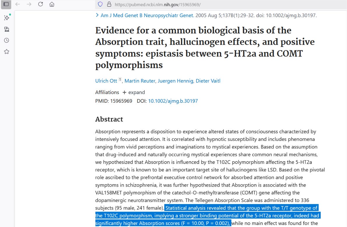 [hypnotic suggestibility is related to serotonin] — Ott U, Reuter M, Hennig J, Vaitl D. Evidence for a common biological basis of the Absorption trait, hallucinogen effects, and positive symptoms: epistasis between 5-HT2a and COMT polymorphisms. Am J Med Genet B Neuropsychiatr Genet. 2005 Aug 5;137B(1):29-32. doi: 10.1002/ajmg.b.30197. PMID: 15965969. https://pubmed.ncbi.nlm.nih.gov/15965969/
