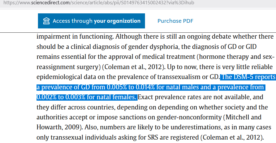 [less than 1 in 10,000 have gender dysphoria] — Smith ES, Junger J, Derntl B, Habel U. The transsexual brain--A review of findings on the neural basis of transsexualism. Neurosci Biobehav Rev. 2015 Dec;59:251-66. doi: 10.1016/j.neubiorev.2015.09.008. Epub 2015 Sep 30. PMID: 26429593. https://www.sciencedirect.com/science/article/abs/pii/S0149763415002432?via%3Dihub