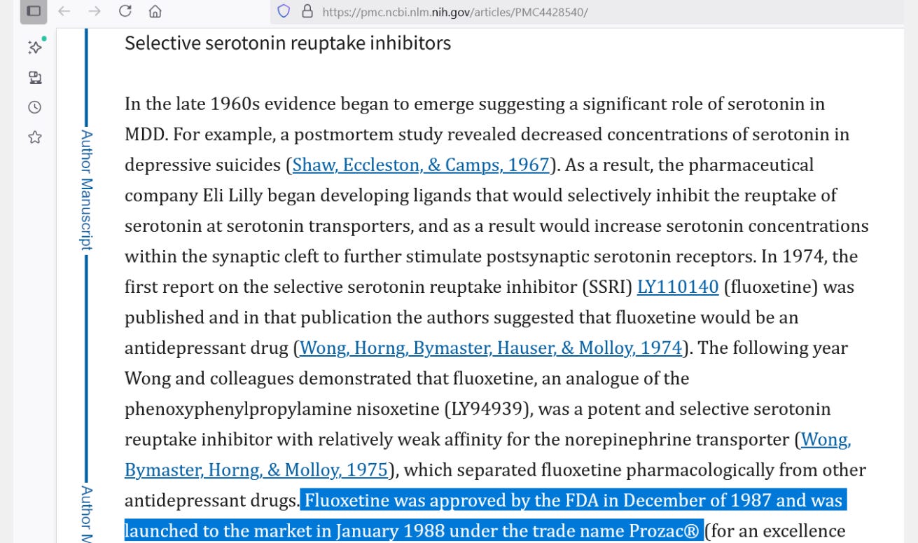 [Prozac got approved in December of 1987] — Hillhouse TM, Porter JH. A brief history of the development of antidepressant drugs: from monoamines to glutamate. Exp Clin Psychopharmacol. 2015 Feb;23(1):1-21. doi: 10.1037/a0038550. PMID: 25643025; PMCID: PMC4428540. https://pubmed.ncbi.nlm.nih.gov/25643025/