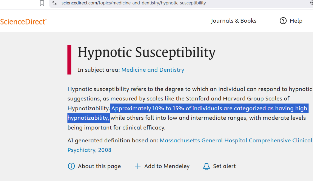 [only 1 in 7 people are easy to hypnotize] — https://www.sciencedirect.com/topics/medicine-and-dentistry/hypnotic-susceptibility
