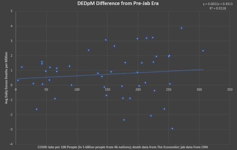 The sample size is 5 billion people from 46 of the 50 largest nations. In looking just at the effect of the COVID jab on excess death (post-jab excess death minus pre-jab excess death), there is also a positive trend, but it failed to reach significance: