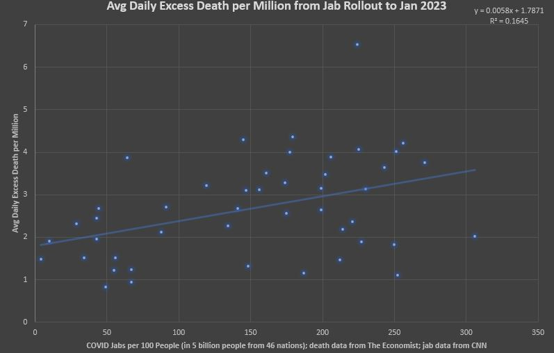 If you take the 50 most-populous nations and remove 4 outliers/potential confounders — Afghanistan, China, Russia, and Ukraine — the average daily excess death per million (DEDpM) from rollout to Jan 2023 significantly positively correlates with COVID jab uptake level (more jabs = more excess death):