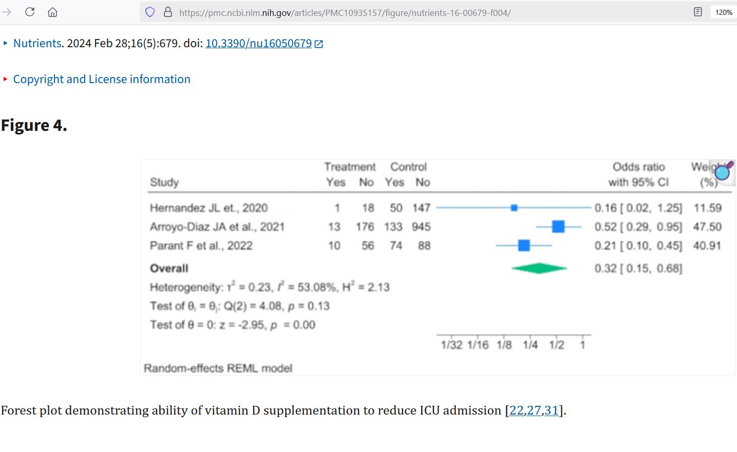 [strong evidence of important benefit from vitamin D with COVID] — Sartini M, Del Puente F, Oliva M, Carbone A, Bobbio N, Schinca E, Giribone L, Cristina ML. Preventive Vitamin D Supplementation and Risk for COVID-19 Infection: A Systematic Review and Meta-Analysis. Nutrients. 2024 Feb 28;16(5):679. doi: 10.3390/nu16050679. PMID: 38474807; PMCID: PMC10935157. https://pmc.ncbi.nlm.nih.gov/articles/PMC10935157/
