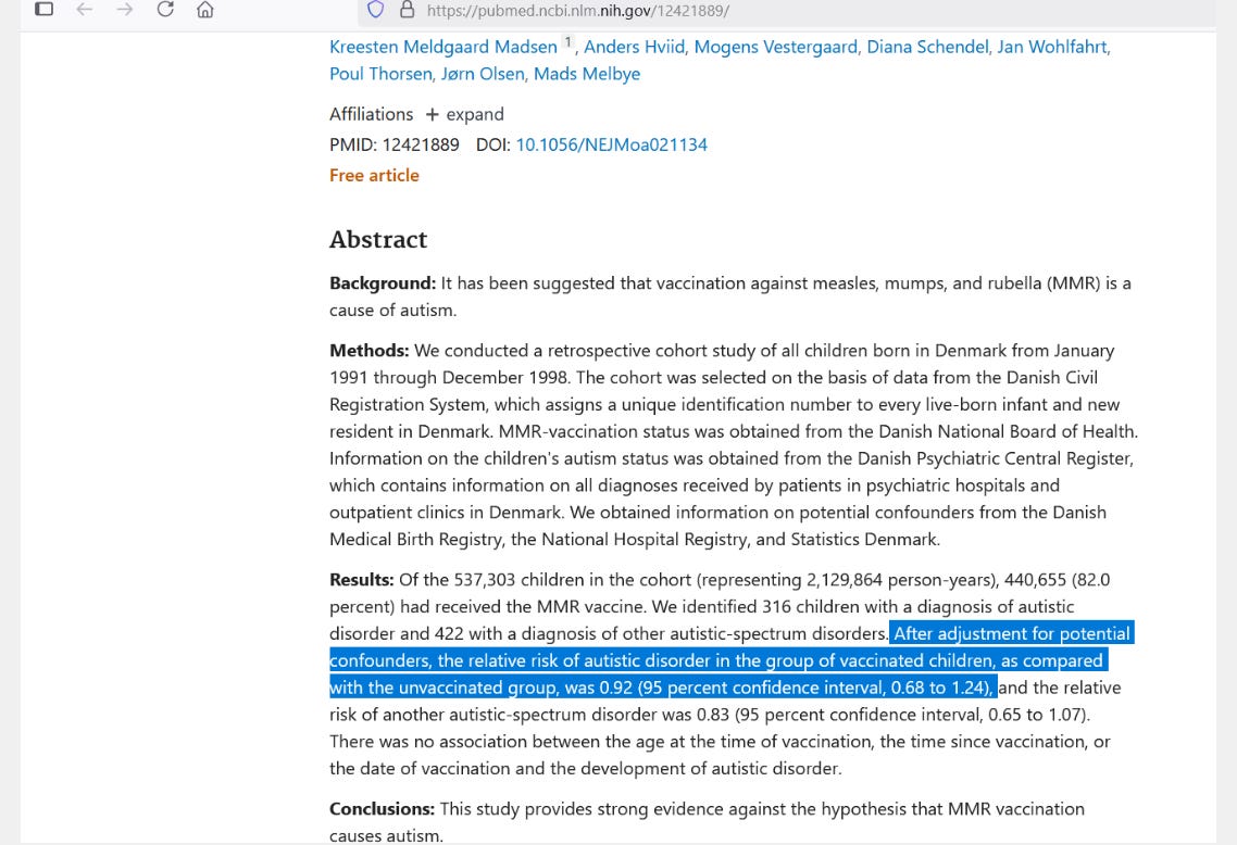 [contrary to author claims, no strong evidence of no effect was found with MMR vaccines vs. autism] — Madsen KM, Hviid A, Vestergaard M, Schendel D, Wohlfahrt J, Thorsen P, Olsen J, Melbye M. A population-based study of measles, mumps, and rubella vaccination and autism. N Engl J Med. 2002 Nov 7;347(19):1477-82. doi: 10.1056/NEJMoa021134. PMID: 12421889. https://pubmed.ncbi.nlm.nih.gov/12421889/