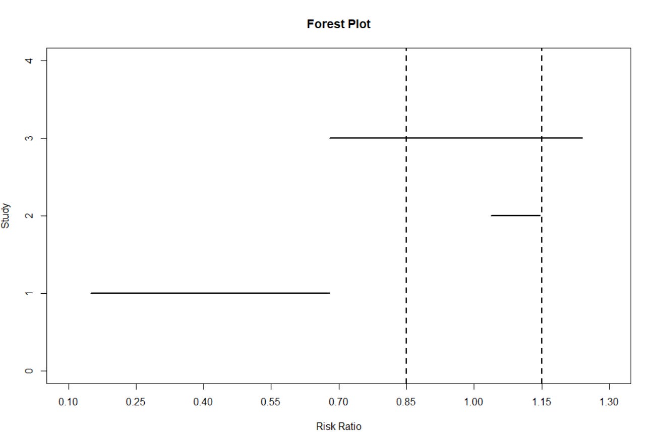 An imaginary vertical line at “risk ratio (RR) = 1.00” would indicate the “line of no difference” between a treated group and a control group. But the important lines are the dotted lines. The one at left shows a 15% reduction in risk for something (RR = 0.85) and the one on the right shows a 15% increase in risk for something (RR=1.15).