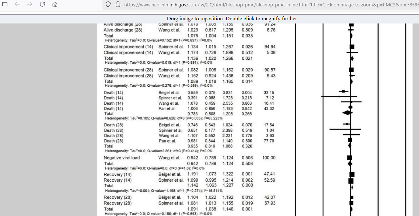 [strong evidence of no important benefit for 28-day recovery with remdesivir] — Rezagholizadeh A, Khiali S, Sarbakhsh P, Entezari-Maleki T. Remdesivir for treatment of COVID-19; an updated systematic review and meta-analysis. Eur J Pharmacol. 2021 Apr 15;897:173926. doi: 10.1016/j.ejphar.2021.173926. Epub 2021 Feb 4. PMID: 33549577; PMCID: PMC7859696. https://pmc.ncbi.nlm.nih.gov/articles/PMC7859696/