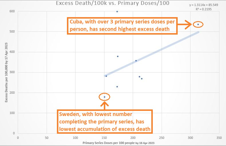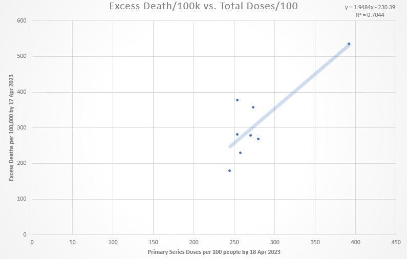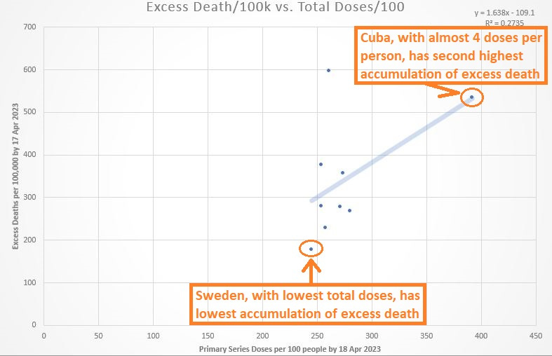 That’s for the total number of administered doses per 100 people (horizontal axis), viewed against the accumulation of excess death per 100,000 people (vertical axis).