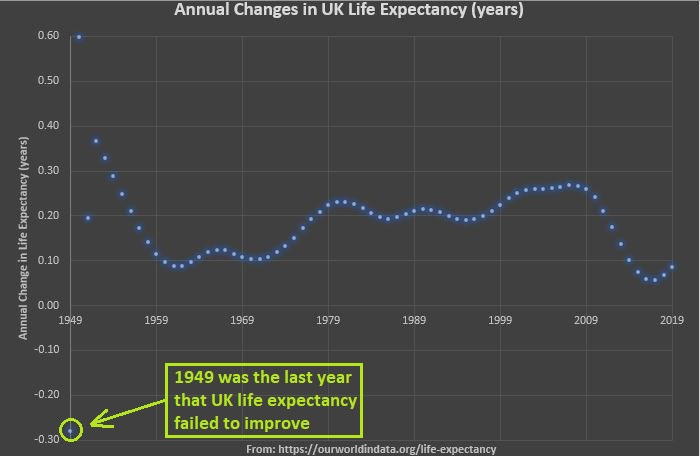 And let’s zoom in on the right end of the yearly changes, beginning with the very last time in the UK (1949) when the life expectancy had failed to improve from one year to the next: