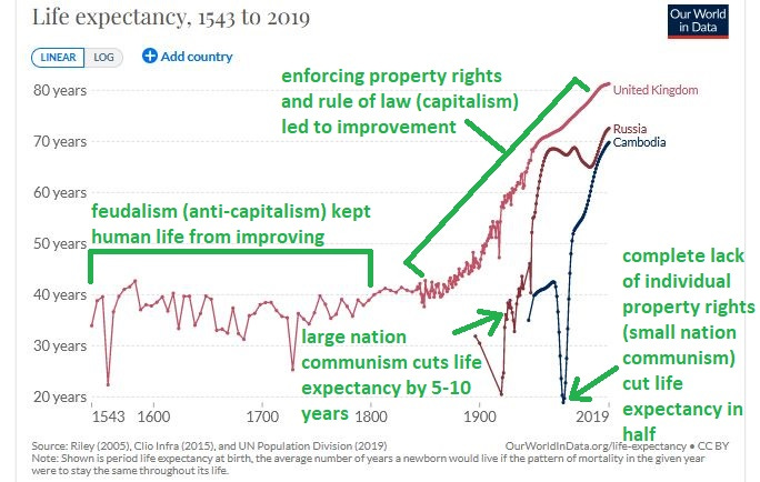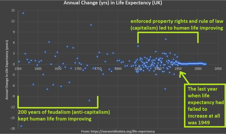 Even the stagnation at left in the UK — where life expectancy could not improve over centuries — was due to feudalism which prevented the enforcement of individual private property rights and an objective rule of law.