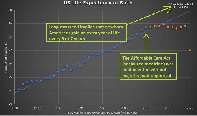 The breaking of trend in increased life expectancy occurred in the very same year that the Affordable Care Act passed. In all years that followed, life expectancy could not improve.