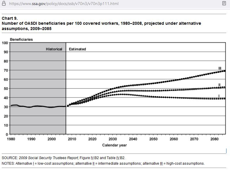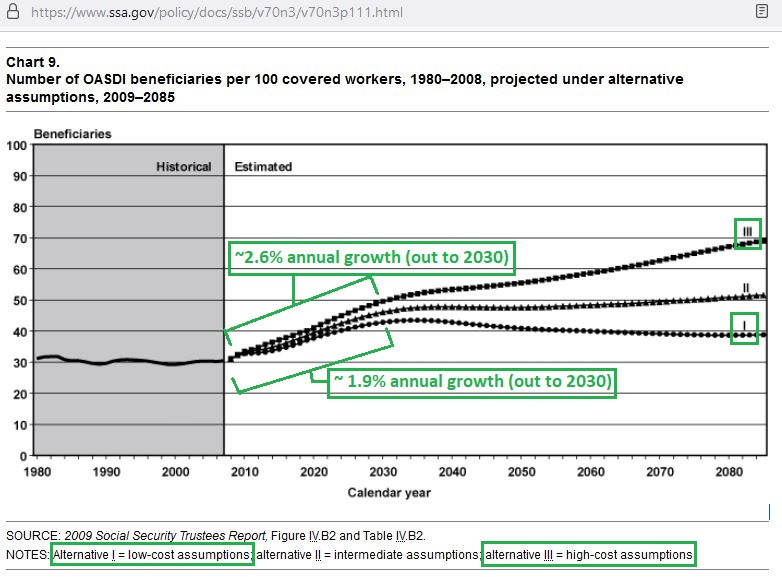 The beneficiaries are increasing faster than the workers, especially so out to 2030. In fact, here is a visual guess at the rate of increase in this ratio, using the two extreme scenarios for cost assumptions: