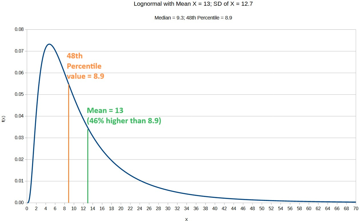 Here is a distribution of values with extreme right skew, where the mean is the 66th Percentile data value (two-thirds of data lie below the mean):