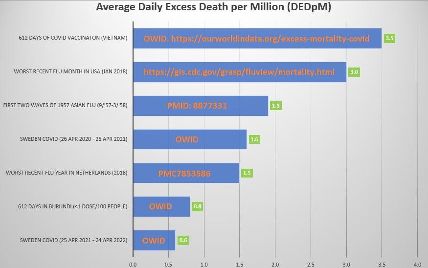 The average rate of excess death accrual for the 612 days after the rollout was 3.5 daily excess deaths per million (DEDpM). To put this into vital perspective, compare it to other notable average daily rates of excess death: