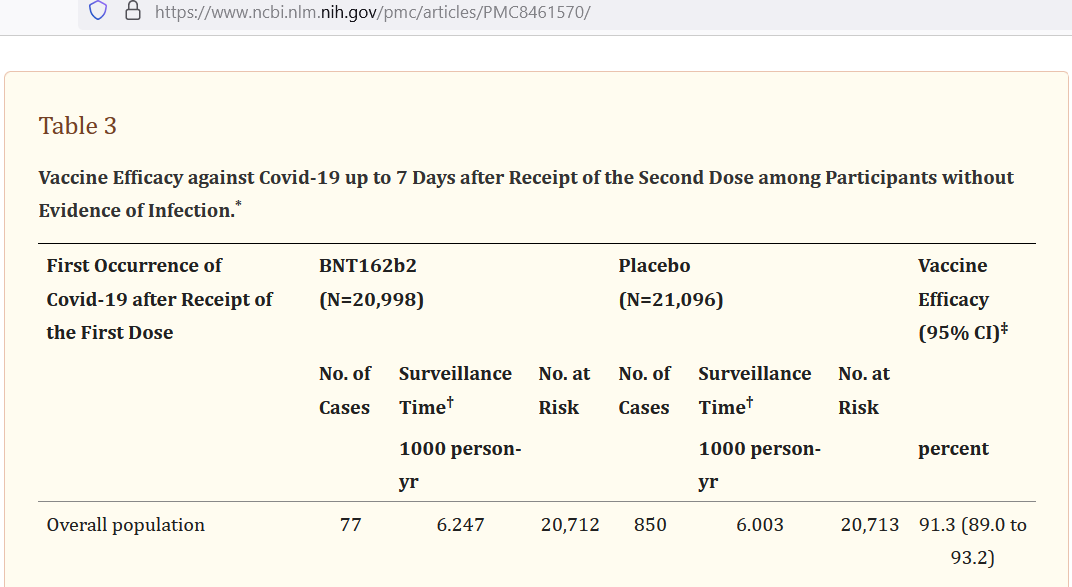 [14.2% annualized attack rate] — Thomas SJ, Moreira ED Jr, Kitchin N, Absalon J, Gurtman A, Lockhart S, Perez JL, Pérez Marc G, Polack FP, Zerbini C, Bailey R, Swanson KA, Xu X, Roychoudhury S, Koury K, Bouguermouh S, Kalina WV, Cooper D, Frenck RW Jr, Hammitt LL, Türeci Ö, Nell H, Schaefer A, Ünal S, Yang Q, Liberator P, Tresnan DB, Mather S, Dormitzer PR, Şahin U, Gruber WC, Jansen KU; C4591001 Clinical Trial Group. Safety and Efficacy of the BNT162b2 mRNA Covid-19 Vaccine through 6 Months. N Engl J Med. 2021 Nov 4;385(19):1761-1773. doi: 10.1056/NEJMoa2110345. Epub 2021 Sep 15. PMID: 34525277; PMCID: PMC8461570. https://www.ncbi.nlm.nih.gov/pmc/articles/PMC8461570/