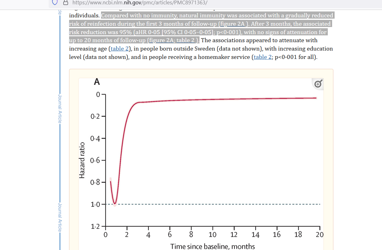 [20 months of 95% protection against reinfection] — Nordström P, Ballin M, Nordström A. Risk of SARS-CoV-2 reinfection and COVID-19 hospitalisation in individuals with natural and hybrid immunity: a retrospective, total population cohort study in Sweden. Lancet Infect Dis. 2022 Jun;22(6):781-790. doi: 10.1016/S1473-3099(22)00143-8. Epub 2022 Apr 1. Erratum in: Lancet Infect Dis. 2022 Apr 8;: PMID: 35366962; PMCID: PMC8971363. https://www.ncbi.nlm.nih.gov/pmc/articles/PMC8971363/