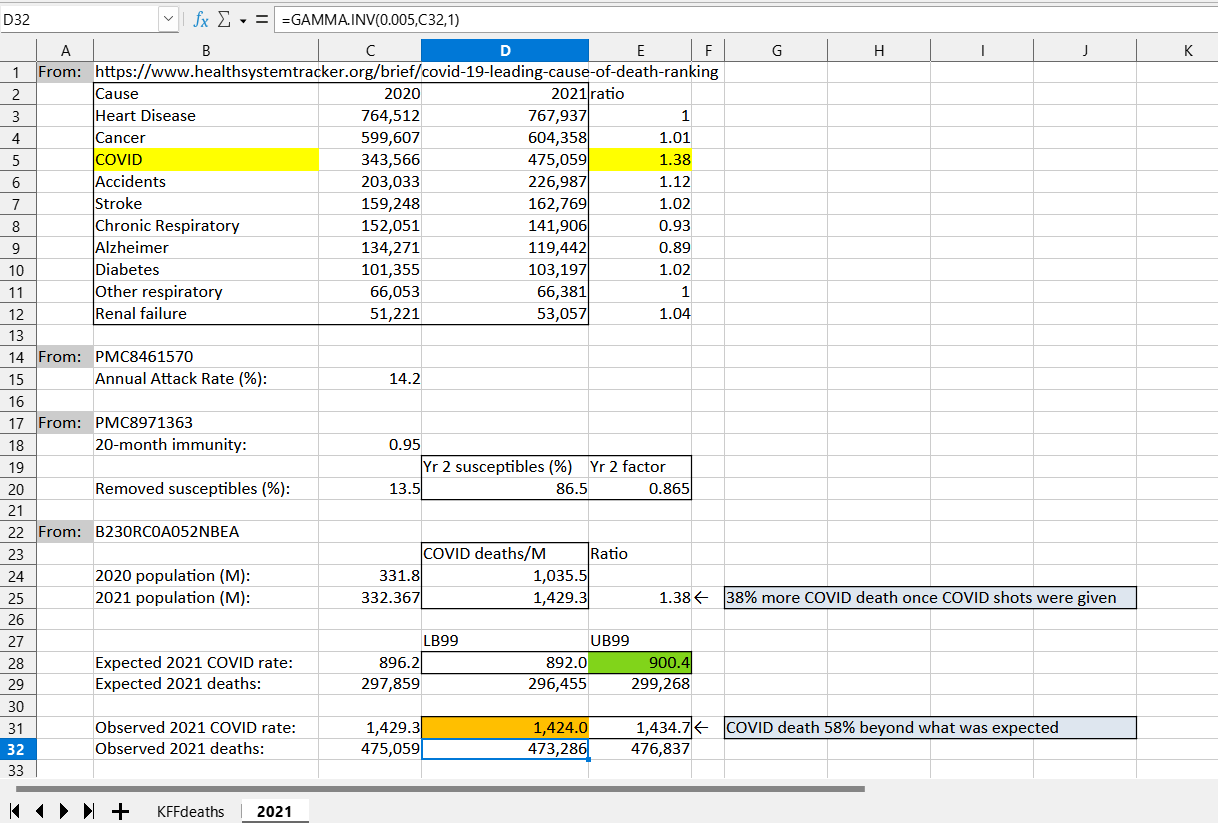 The increased COVID death rate of 2021 was a minimum of 58% beyond expectations, given the lower pool of susceptibles in 2021 compare to 2020: