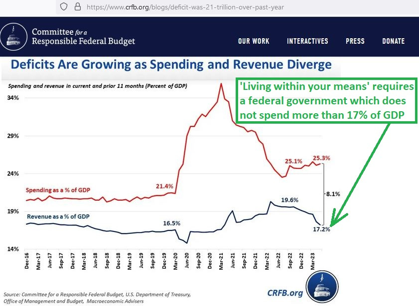 That’s like putting 10% of your grocery bill on a credit card, hoping you’ll never max out and you’ll never get your rates adjusted up. The history of federal revenue provides evidence that suggests that the federal government cannot afford to represent any more than about 17% of GDP (green markings added):