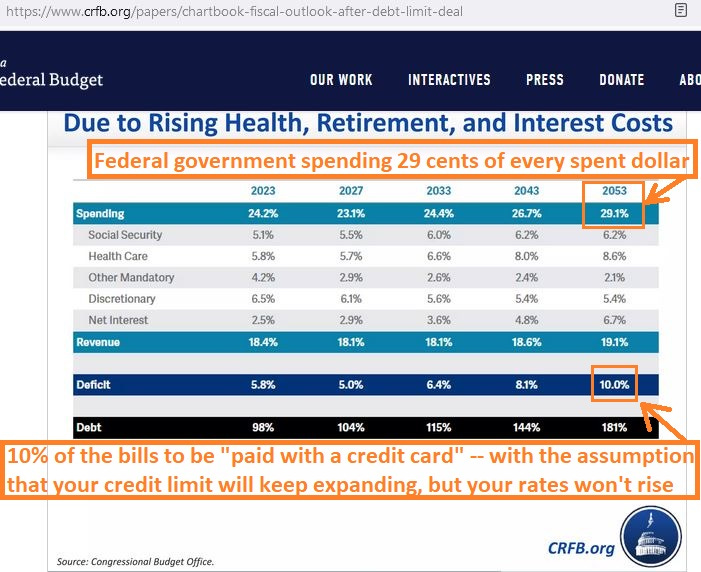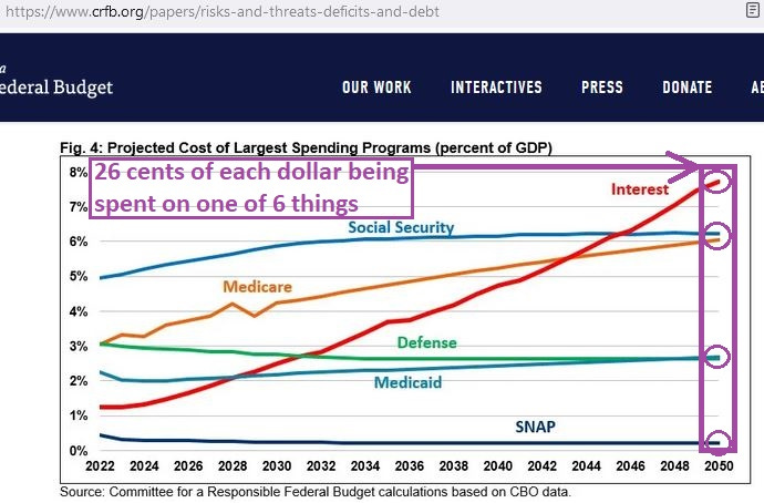 But just projecting 6 federal budget line-items forward in time reveals that, without reform, a sovereign debt crisis is coming to the USA (purple markings added):