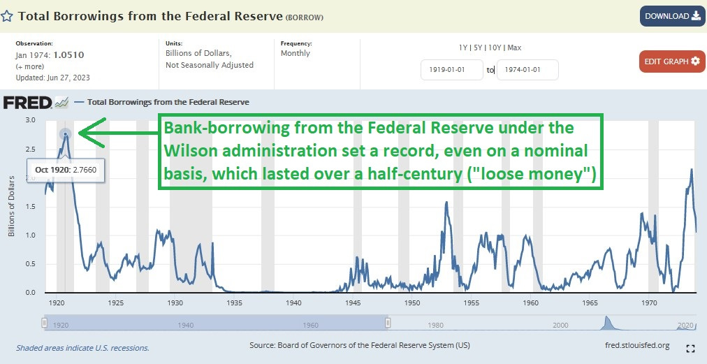 But when big spender and quasi-fascist President Woodrow Wilson signed the Federal Reserve Act in December of 1913, it was like a kid who created a candy store. Even nominally, more money was borrowed in a single month from Federal Reserve than would be the case for over 50 years (green markings added):