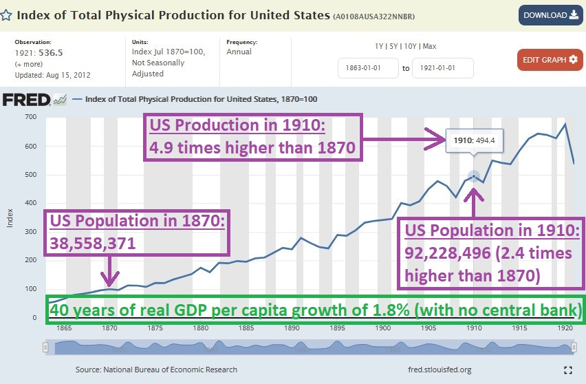 Before a central bank got created in 1913, the USA was doing well. Free enterprise can be volatile, but always tends towards improving the affordability of a standard of living for the greatest number of people. Besides that, it is morally correct. Here’s the record of improvements (green and purple markings added):