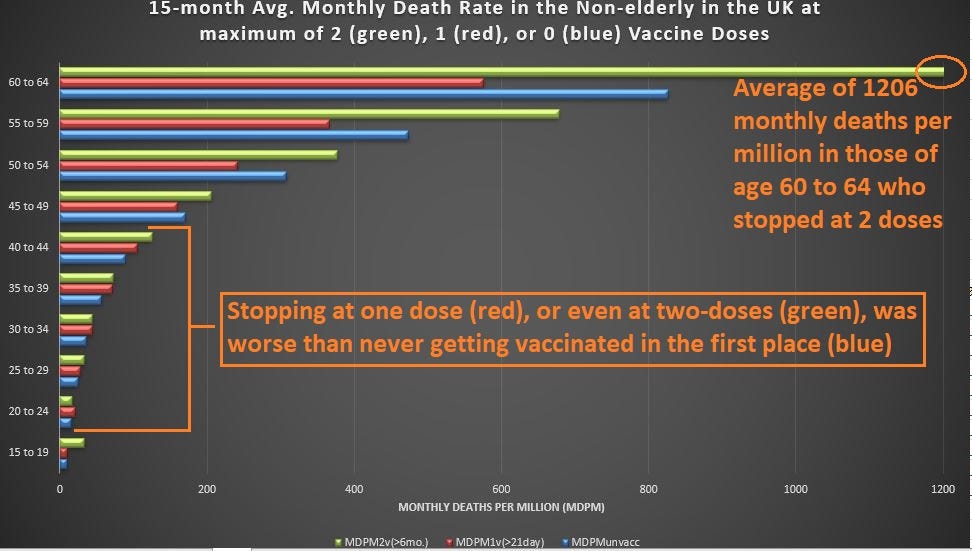 In the non-elderly in the UK, those who took one vaccine dose and stopped, so that they took their single dose over 21 days prior, and those who took two doses and stopped, so that they took their second dose over 6 months prior, ended up dying more than those who never got vaccinated.