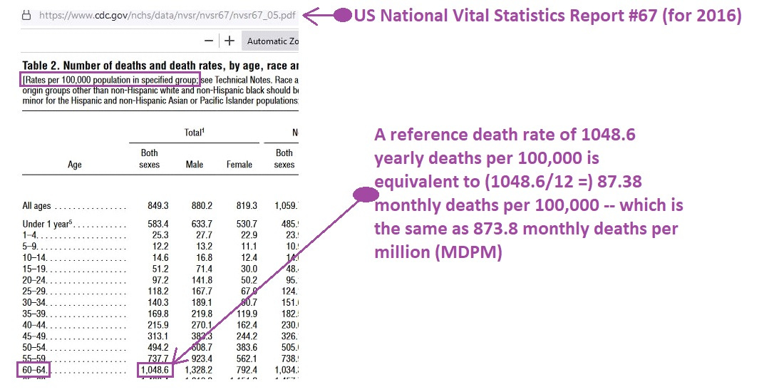 A crude reference monthly death rate for those of age 60 to 64 would be the average monthly death rate for that age group in the US in 2016.