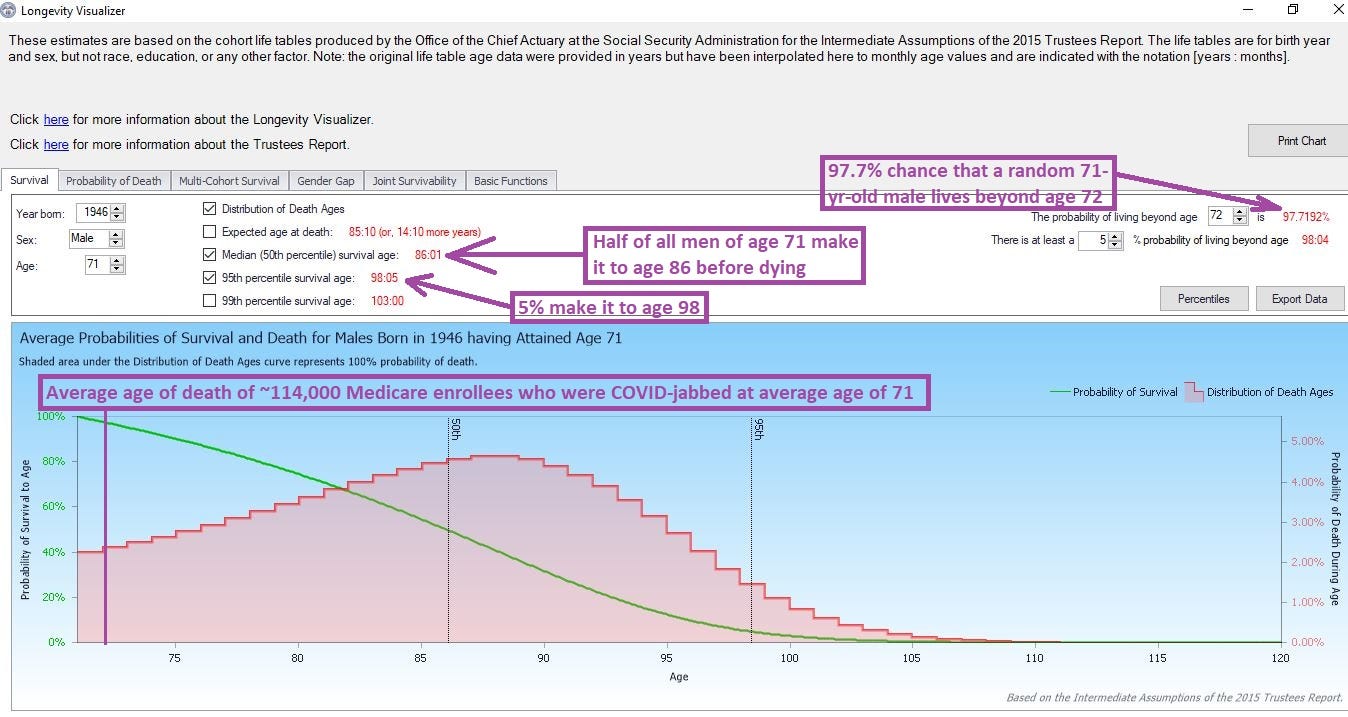 This is important because the average age at death of those jabbed in the Medicare group (jabbed at the average age of 71), was 72 — with the average days-to-death-after-taking-experimental-jab being just 318 days.