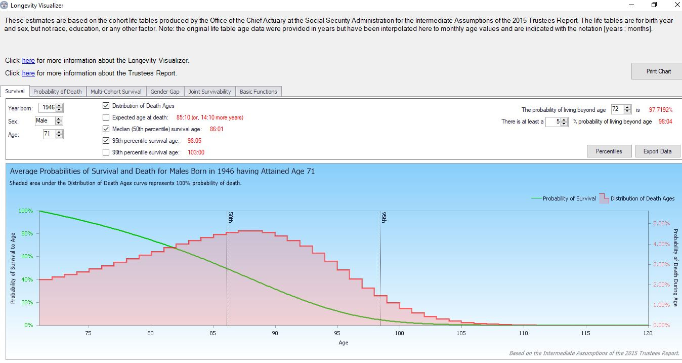 To find out the chances of death that are expected for men of age 71 (women die less), I retrieved a fancy widget from the Social Security Administration. This new-fangled software can tell you, year-by-year, your chance of death.