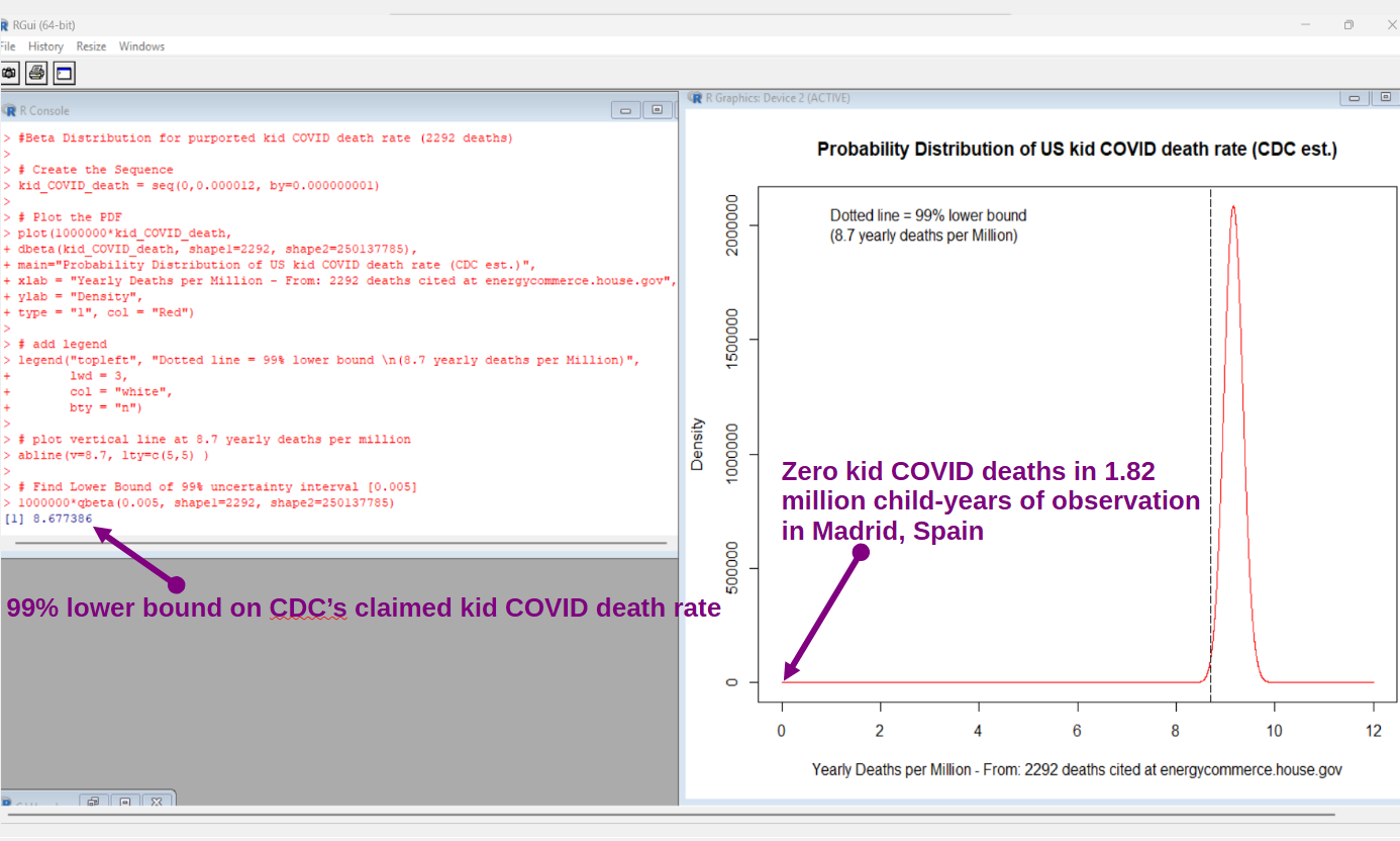 But the dotted vertical line to the left of the peak represents the 99% lower bound of an uncertainty interval formed around CDC’s claim. You do not have to be a statistician to know that something is wrong with CDC’s claim, after witnessing the “zero deaths” outcome of 2.765 million Spanish kids followed for 240 days.