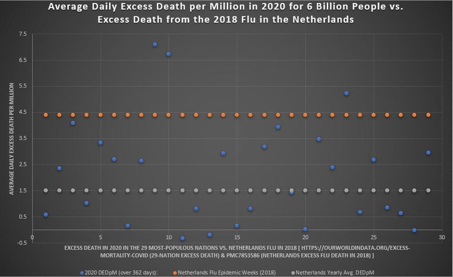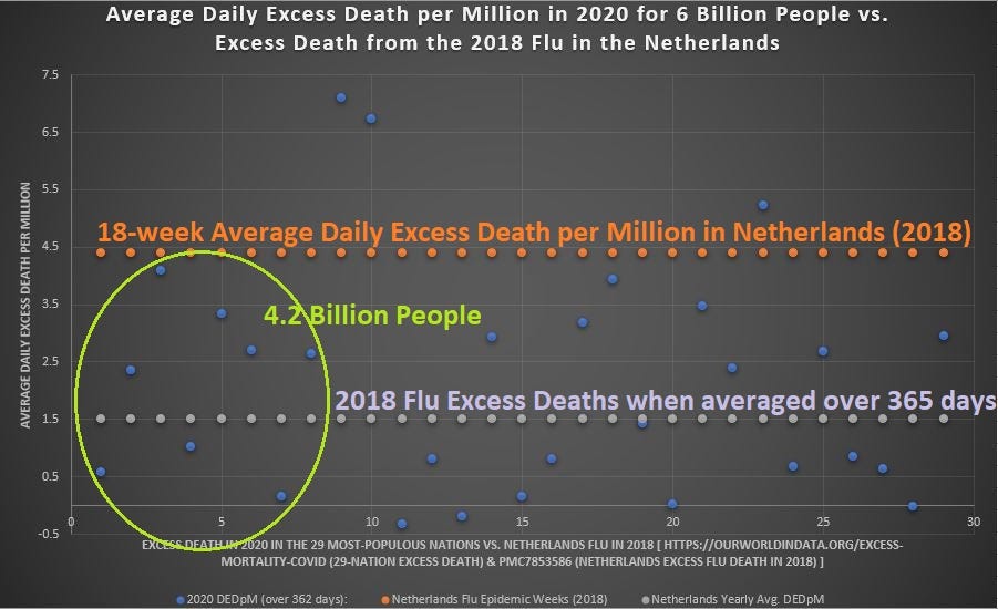 And here is the same chart with notation, showing that most of the world did NOT go through something worse than the worst-ever flu in 2020, as exemplified by the flu experience in the Netherlands from January to April of 2018: