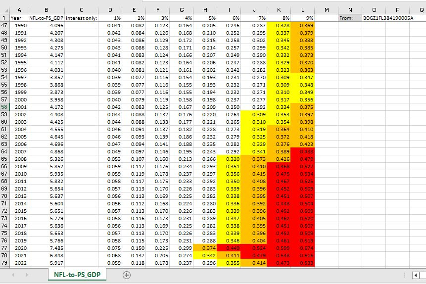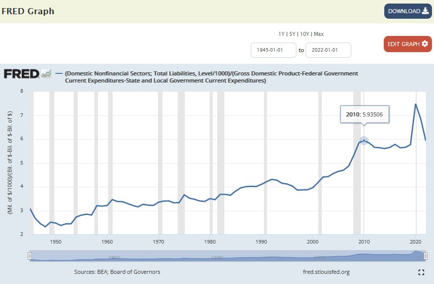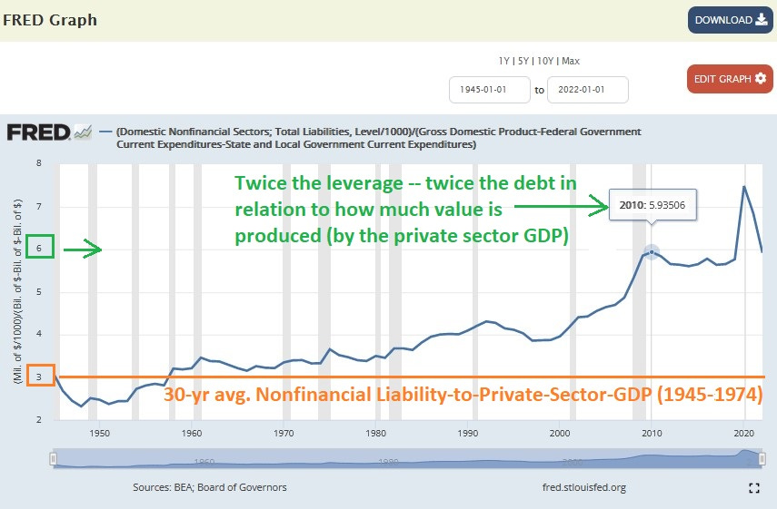 Even if the average interest on all debt owed by all nonfinancial (non-bank) sectors was 9%, the USA would have still only had ‘interest-only’ payments that were 21% of income — if you are looking just at the year of 1948. We had “good credit” back then, because the sum total of all liabilities was less than 3 multiples of income.