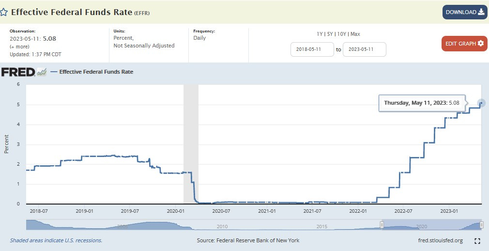 In 2022, things get scary when the average interest paid on debt hits 6%, and 8% is a “deal-breaker.” This is important because the average interest rate paid by all sectors combined has a floor, for the most part, at the federal funds rate (overnight lending to banks) — which just went past 5% recently: