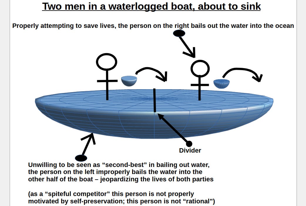 Picture two men in a sinking lifeboat, each outwardly agreeing to help bail out the water, so that they won’t both drown: