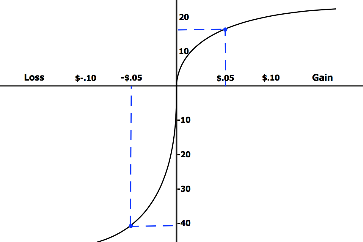 Loss aversion is the “irrational” valuation of losses at a level that is higher than your gains, and many people “suffer” from it. If you gain a nickel, it might provide you with almost 20 hypothetical units of utility or satisfaction, but if you lost a nickel, it could provide you with over 40 of those same units in disutility or dissatisfaction:
