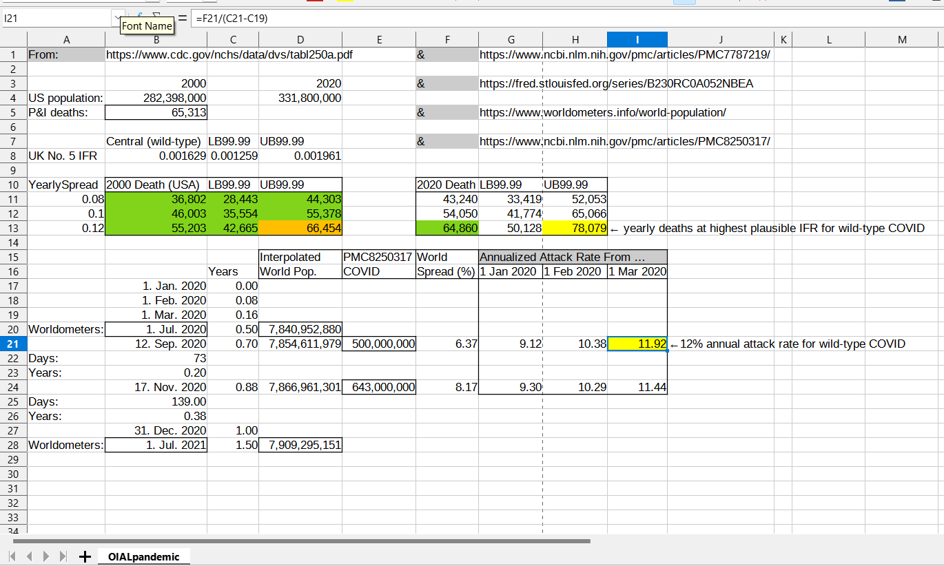 In cell F13 (green) is the central estimate of COVID IFR along with the highest estimate of yearly COVID spread (also called the “attack rate”) applied to the actual US population of 2020. Note how it is still less than the pneumonia+influenza deaths of 2000. The two, dated estimates of COVID spread (from Ioannides) are in column E.