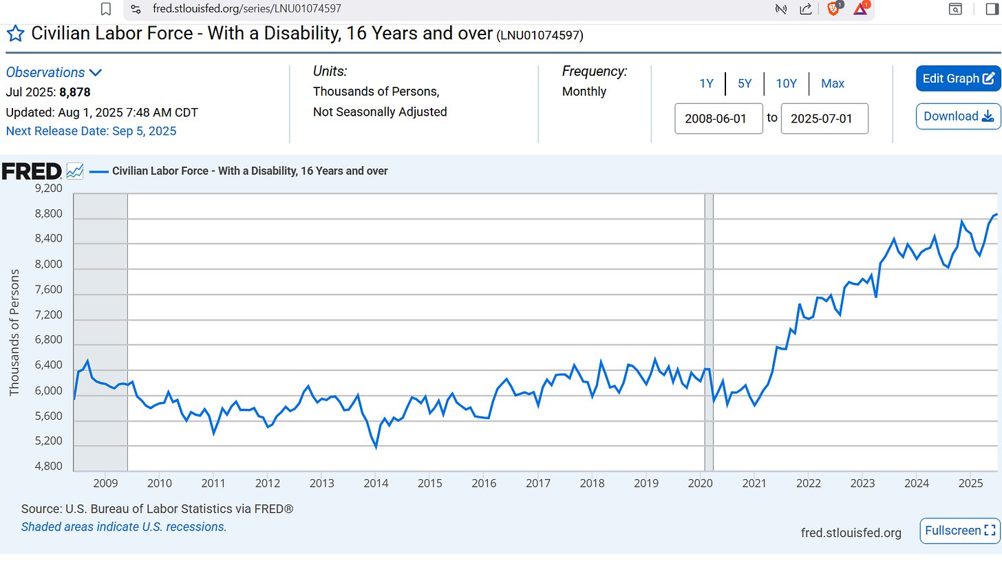 U.S. Bureau of Labor Statistics, Civilian Labor Force - With a Disability, 16 Years and over [LNU01074597], retrieved from FRED, Federal Reserve Bank of St. Louis; https://fred.stlouisfed.org/series/LNU01074597
